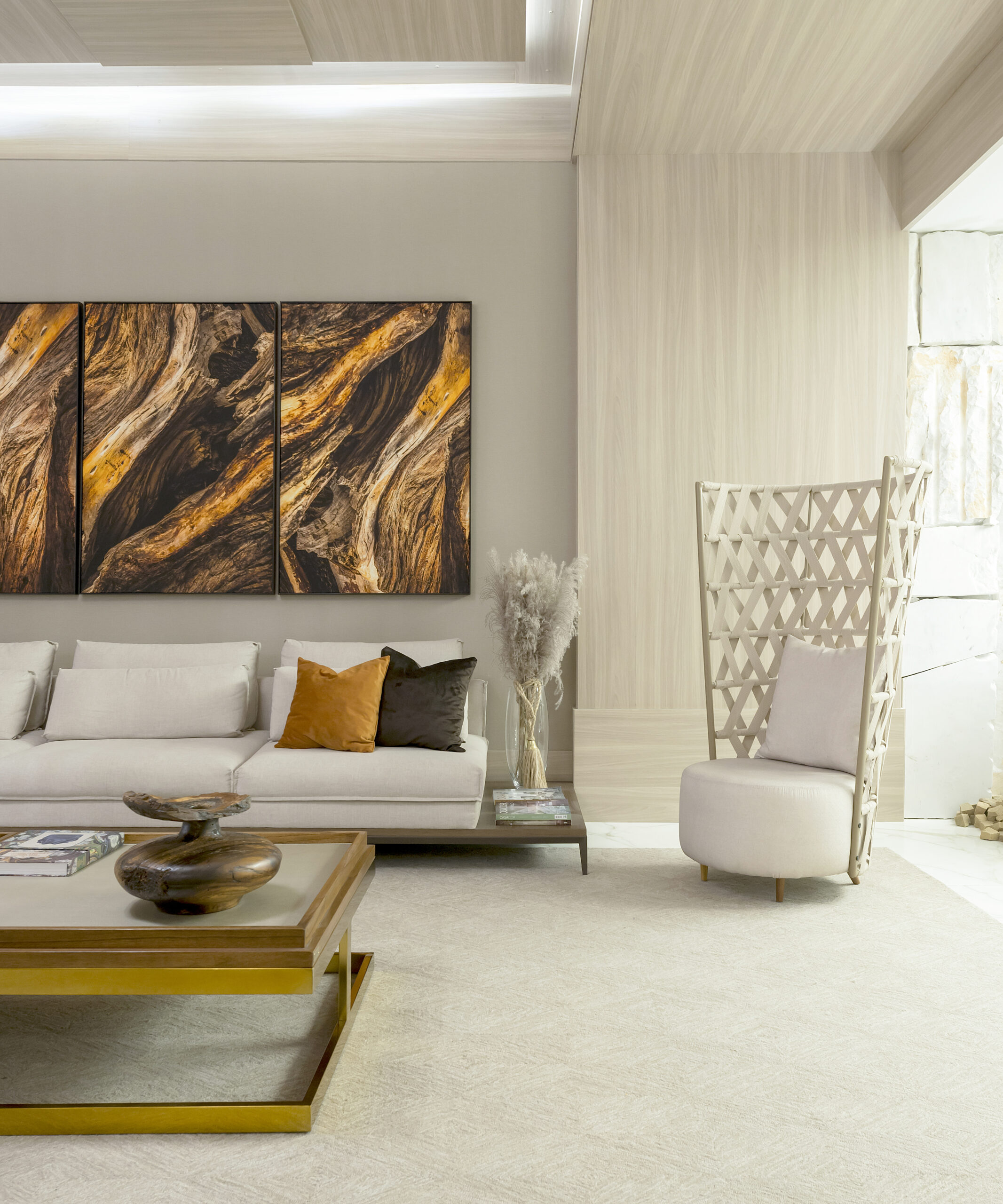 Espetáculos da natureza estão revelados nas obras de arte de Patricia Vieira – outro ponto alto do espaço. Uma delas é a “Árvore da Vida”, um tríptico, com 130X90cm cada, que apresenta a árvore de mesmo nome (Shajarat-al-Hayat) de 30 metros de altura localizada no meio do deserto do Bahrain, no Oriente Médio. Ela se mantém viva, verdejante e saudável, neste ambiente nada favorável há 435 anos e, por isso, simboliza a vida possível diante das adversidades. Outra obra que compõe o ambiente é a “Paraíso Sagrado”, de 200X100cm, fotografia também impressa em tela artística canvas que retrata um cenote existente na selva do sudoeste do México, na Riviera Maia, com data estimada em cinco milhões de anos. Os cenotes são formações geológicas por onde correm rios subterrâneos e poças cristalinas, fontes de água e recintos sagrados da cultura maia. Por fim, a obra “Palmeira Real”, produzida por Patrícia em Abu Dhabi, nos Emirados Árabes, que revela um detalhe de uma árvore majestosa que leva este nome para remeter à realeza e suntuosidade do país.