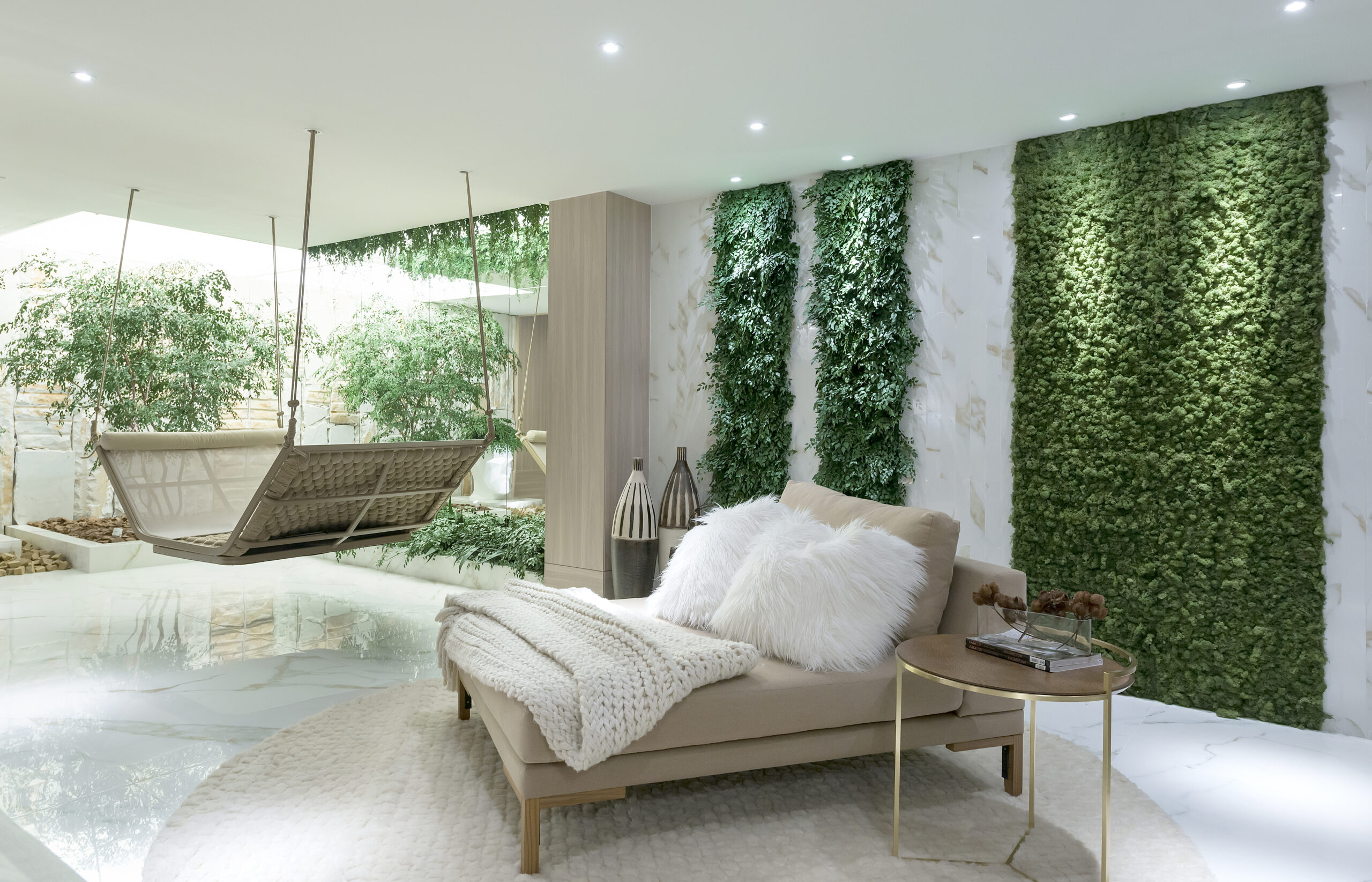 “Queríamos trazer a natureza para dentro de casa de uma forma prática. Apostamos na ‘vegetação preservada’, que não precisa de irrigação e nem manutenção e apresenta um efeito muito natural”, explica a arquiteta Yael, pós-graduada em Paisagismo. Os jardins verticais preservados são criados com plantas naturais que passam por um processo de conservação que mantém a folhagem, a textura e integridade das plantas.