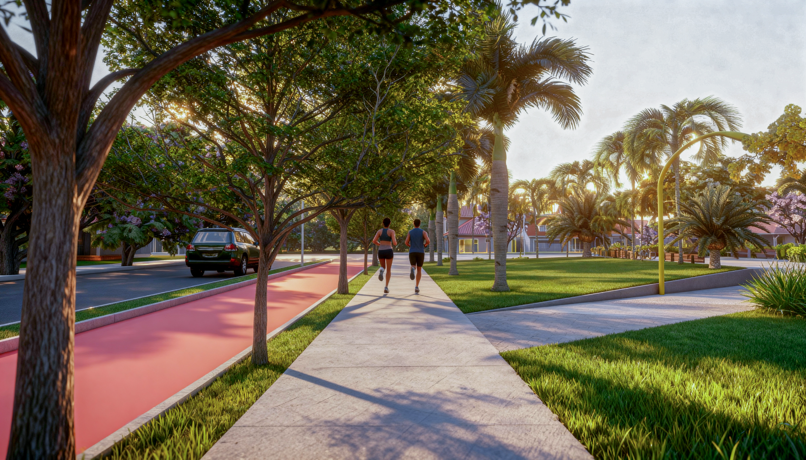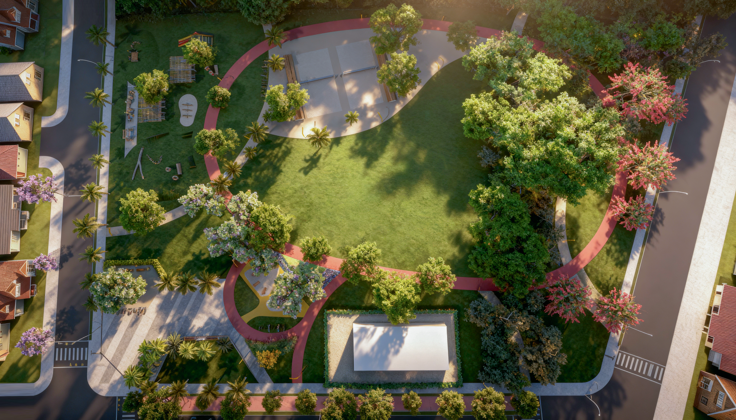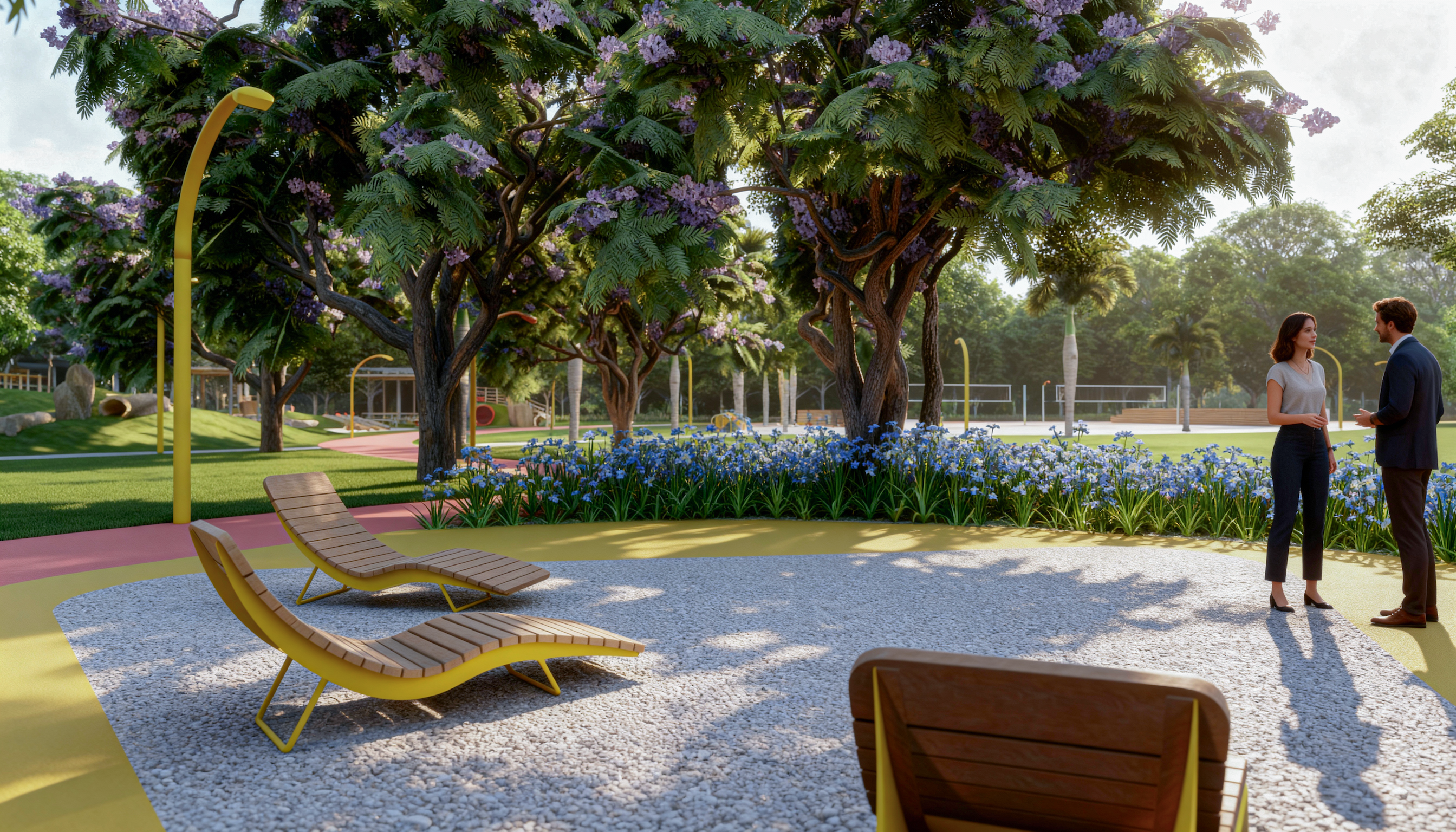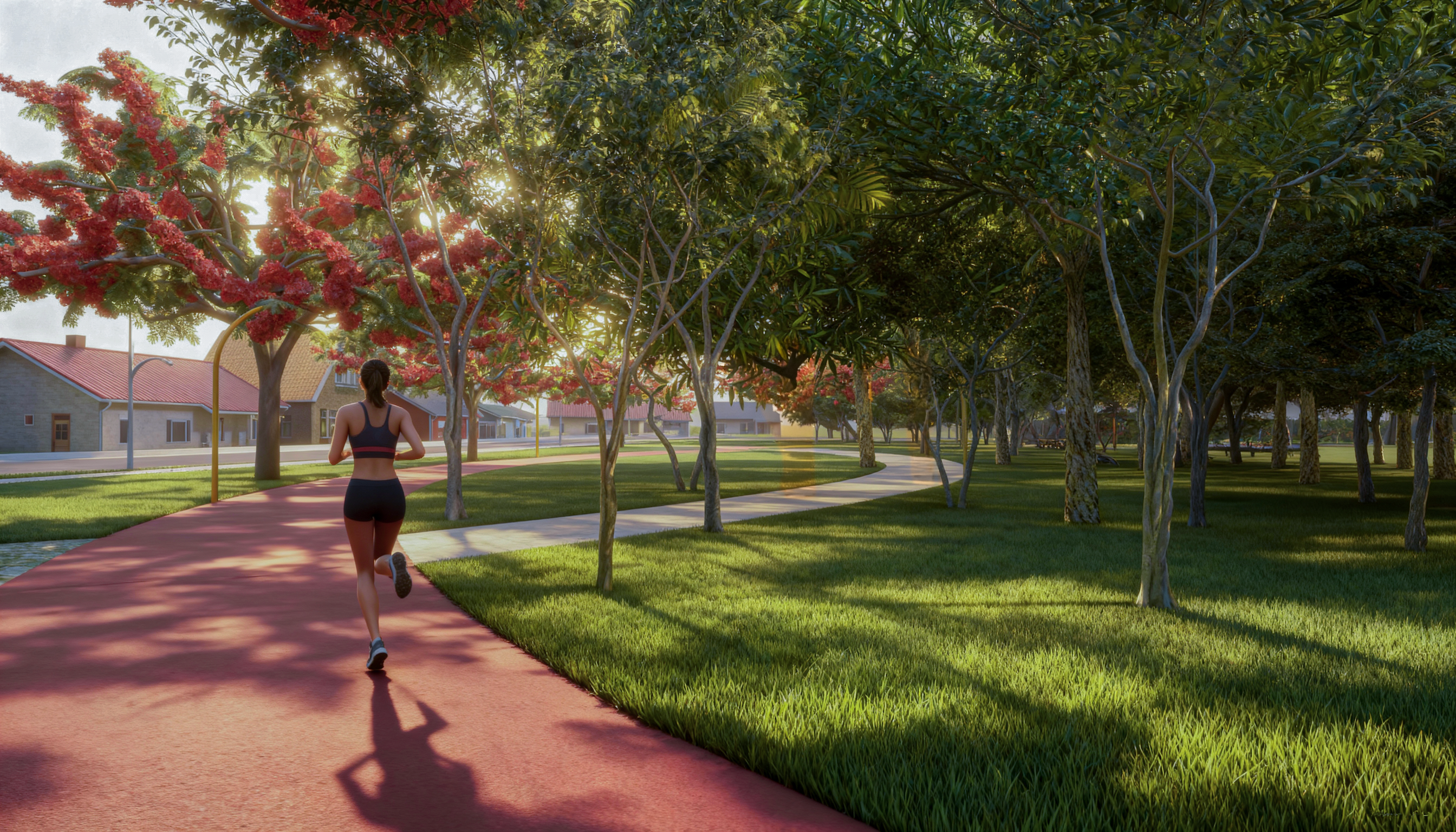 Conceito Paisagístico e Design: O conceito central de Quinta da Luz III é integrar atividade física e convívio social em meio a um paisagismo abundante e regional. Diferentemente das fases anteriores do loteamento, que enfatizaram lazer lúdico e áreas pet, esta etapa foca em esportes ao ar livre e numa relação mais direta com a natureza. O desenho paisagístico orgânico se revela nos caminhos sinuosos e na disposição natural dos espaços: as alamedas e trilhas para corrida serpenteiam pelo terreno, interligando diferentes zonas de uso sem linhas retas rígidas. Essa fluidez do traçado convida os usuários a explorarem o parque por inteiro, descobrindo a cada curva novas perspectivas do projeto. Plantas nativas e de clima local foram priorizadas, não só para criar uma estética genuinamente brasileira como também para proporcionar sombra abundante e um microclima agradável. Ipês, jacarandás e outras espécies regionais oferecem flores sazonais e copa volumosa, tornando o passeio convidativo em qualquer época do ano. A paleta de materiais e cores reforça a identidade do lugar: equipamentos esportivos com detalhes em tons vibrantes (como o vermelho da pista de corrida) contrastam com o verde dominante da vegetação, criando um visual contemporâneo e atrativo.