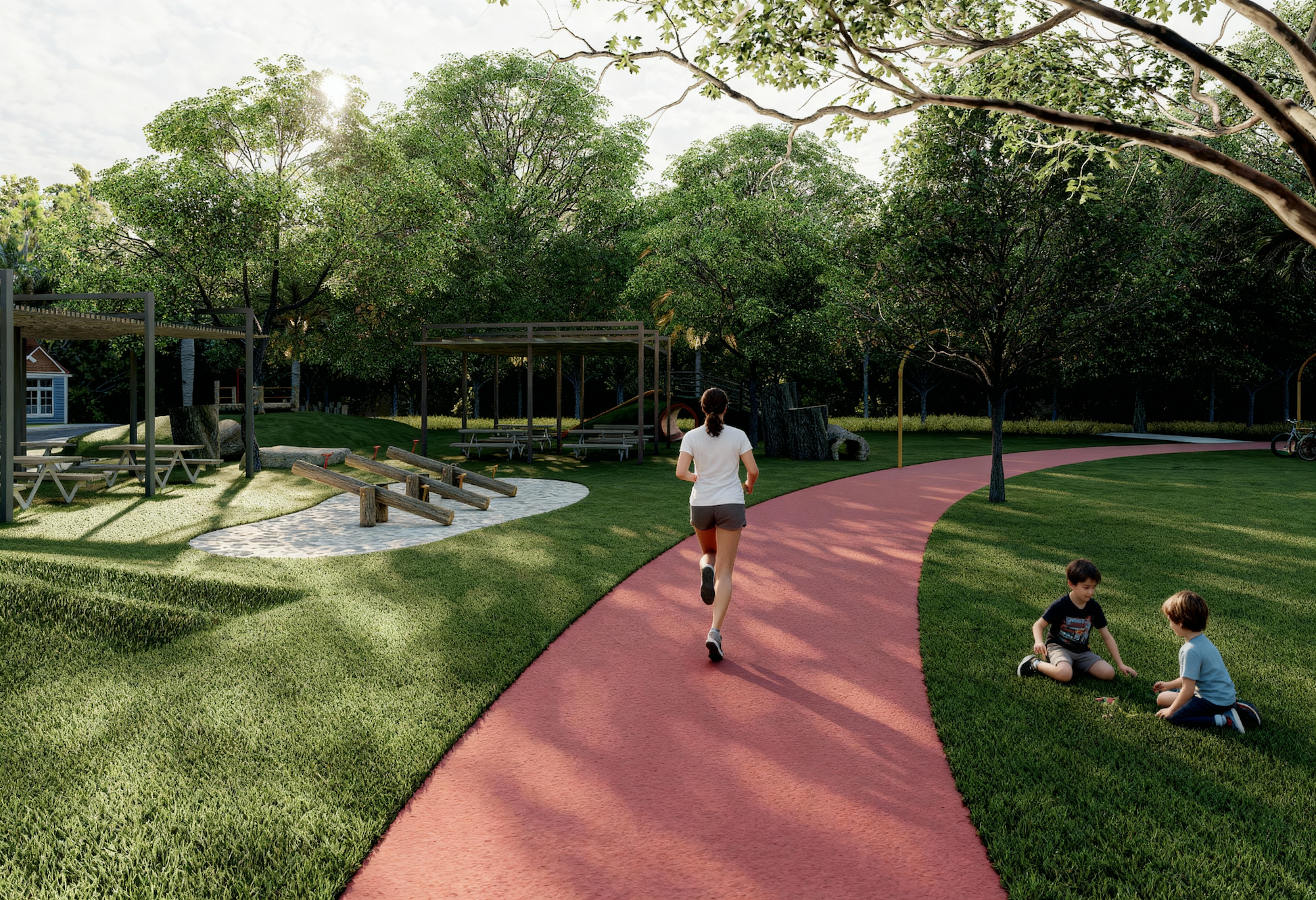 Conceito Paisagístico e Design: O conceito central de Quinta da Luz III é integrar atividade física e convívio social em meio a um paisagismo abundante e regional. Diferentemente das fases anteriores do loteamento, que enfatizaram lazer lúdico e áreas pet, esta etapa foca em esportes ao ar livre e numa relação mais direta com a natureza. O desenho paisagístico orgânico se revela nos caminhos sinuosos e na disposição natural dos espaços: as alamedas e trilhas para corrida serpenteiam pelo terreno, interligando diferentes zonas de uso sem linhas retas rígidas. Essa fluidez do traçado convida os usuários a explorarem o parque por inteiro, descobrindo a cada curva novas perspectivas do projeto. Plantas nativas e de clima local foram priorizadas, não só para criar uma estética genuinamente brasileira como também para proporcionar sombra abundante e um microclima agradável. Ipês, jacarandás e outras espécies regionais oferecem flores sazonais e copa volumosa, tornando o passeio convidativo em qualquer época do ano. A paleta de materiais e cores reforça a identidade do lugar: equipamentos esportivos com detalhes em tons vibrantes (como o vermelho da pista de corrida) contrastam com o verde dominante da vegetação, criando um visual contemporâneo e atrativo.
