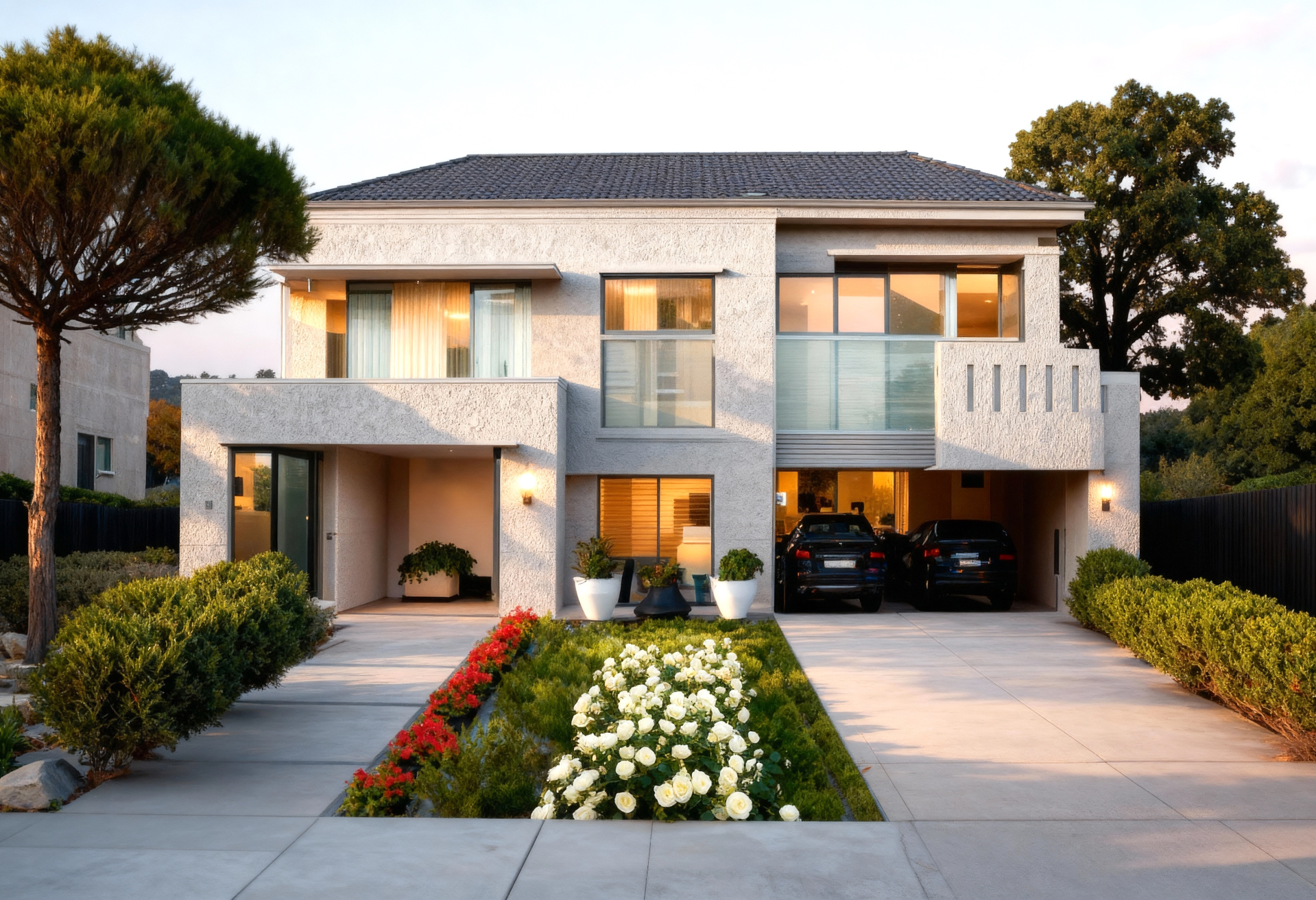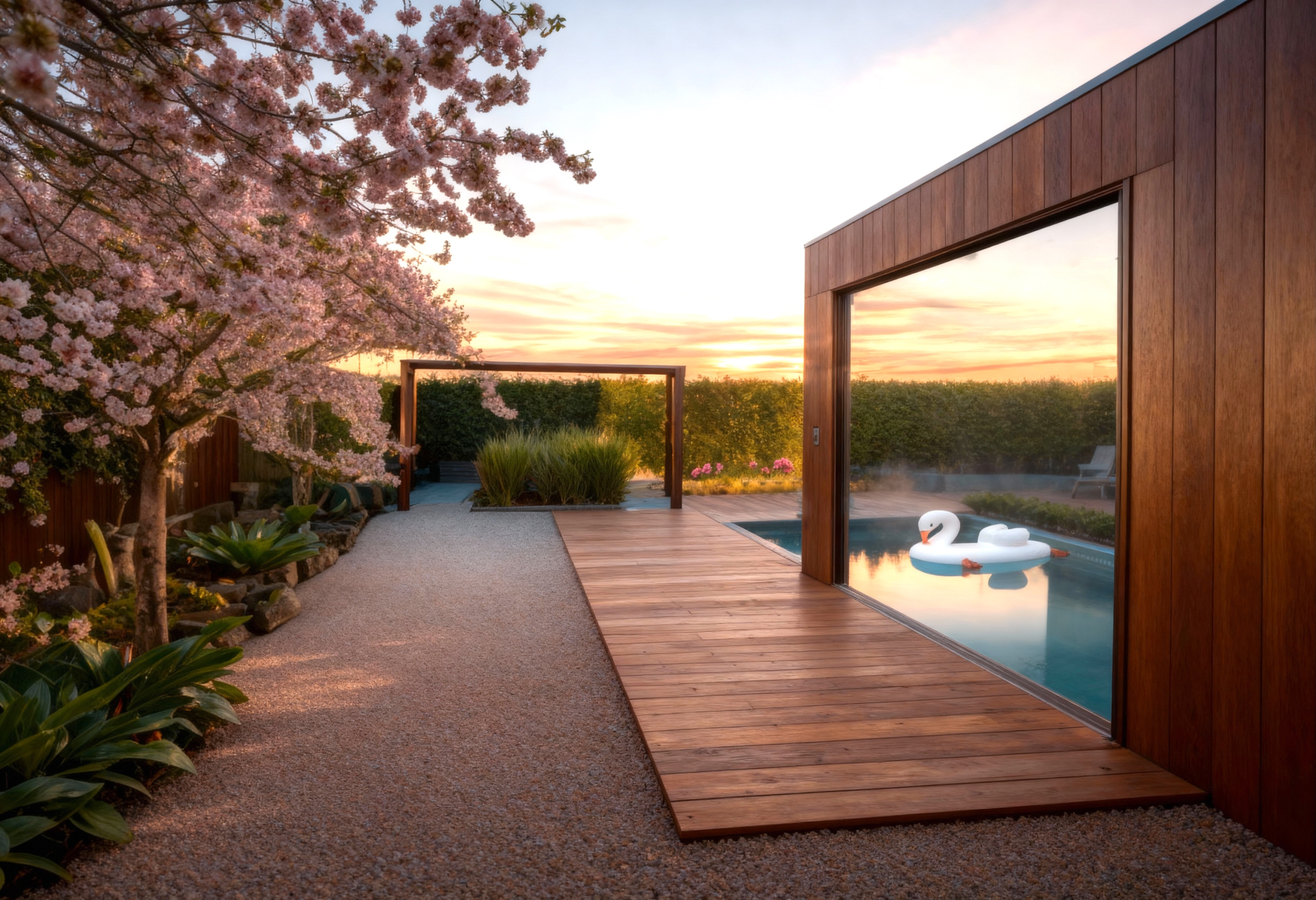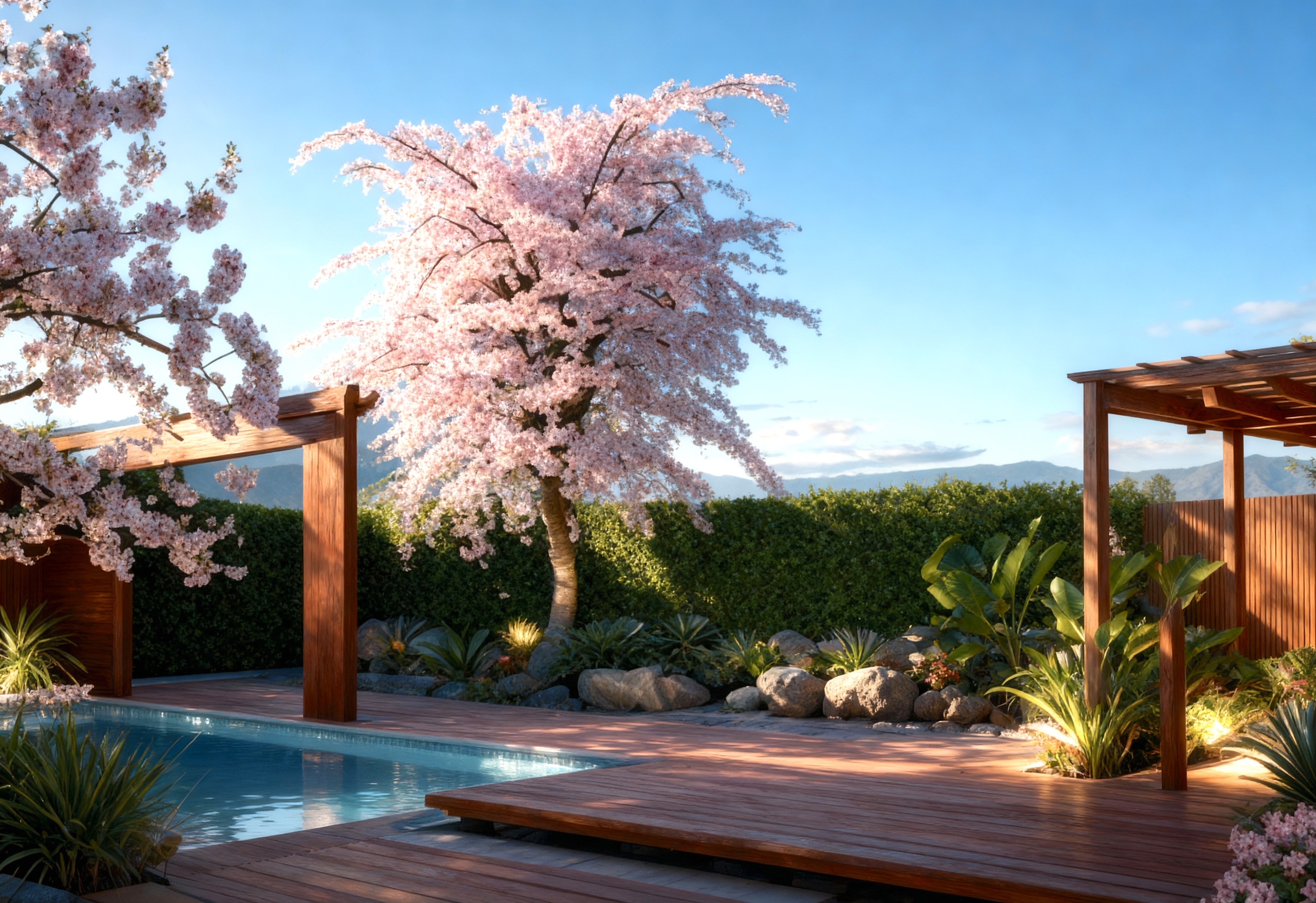 Neste projeto desenvolvido na Austrália, a proposta integrou a elegância do estilo clássico com a força expressiva da paisagem natural para criar um conjunto visual marcante. A fachada apresenta um paisagismo clássico, com linhas simétricas e composição refinada, que valoriza a arquitetura e estabelece uma atmosfera de ordem e sofisticação. Nos fundos, o ambiente ganha outra dimensão com um paisagismo mais imponente, onde cerejeiras em flor contrastam com o verde, um deck de madeira robusto estrutura a área de convívio e a combinação de pedras e plantas reforça a conexão com a natureza. A transição entre o clássico e o natural cria um espaço dinâmico e inspirador, traduzindo a fusão entre tradição, contemporaneidade e o estilo de vida do local.