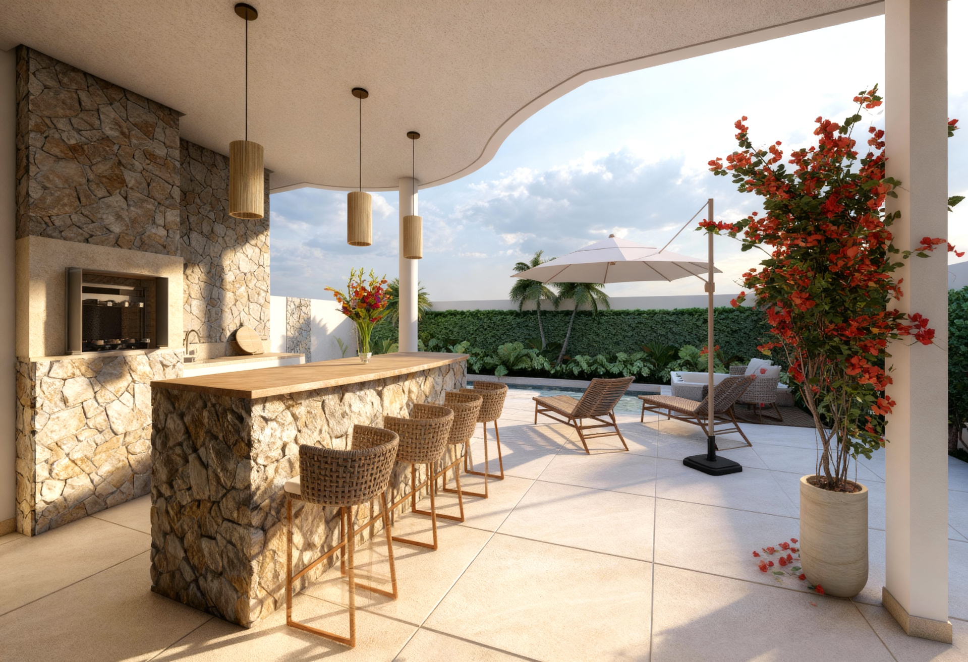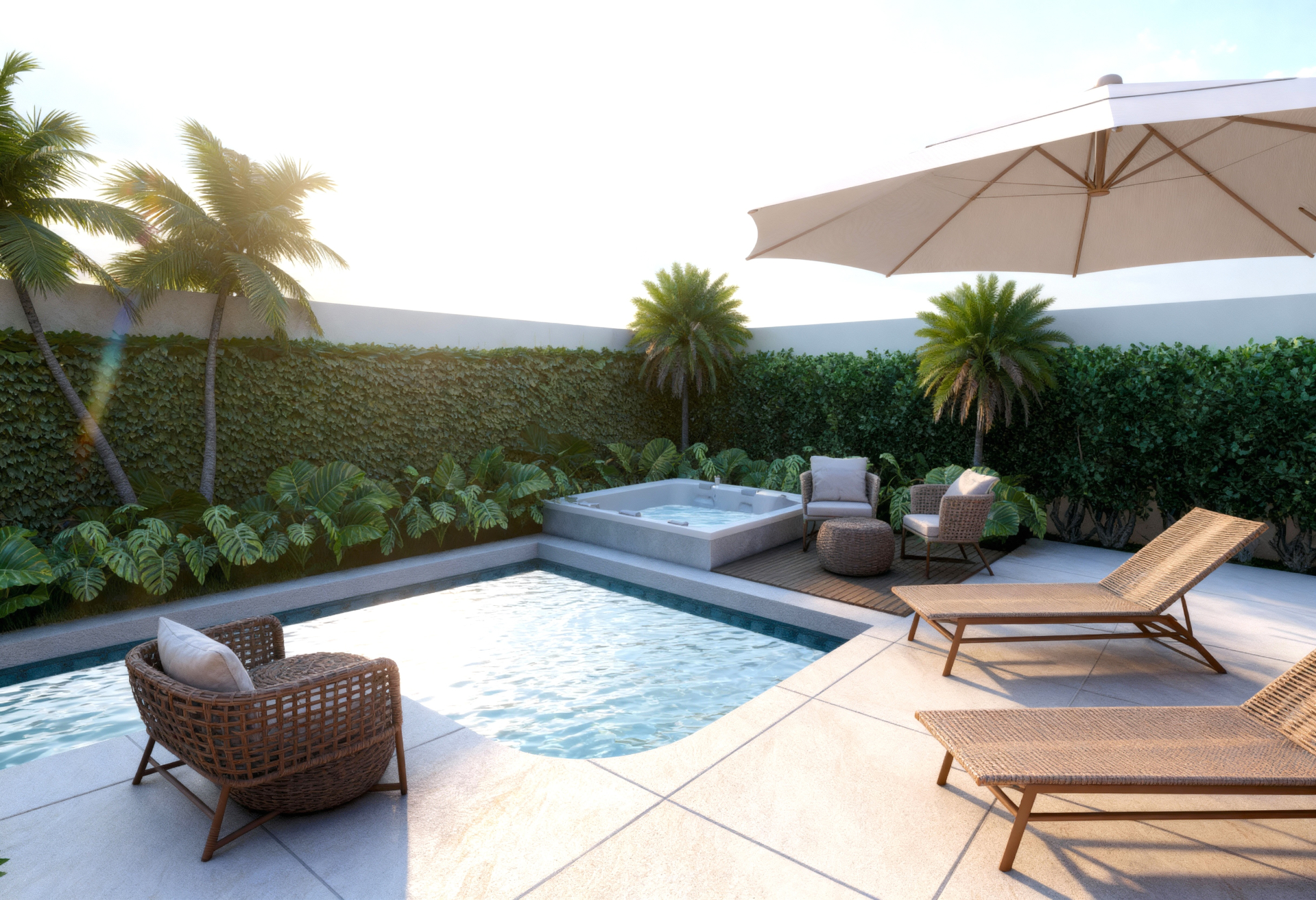 Na Casa Manjubas, em Florianópolis, realizamos um retrofit completo da área externa, renovando pisos, revestimentos e reorganizando o jardim para criar um espaço mais contemporâneo e acolhedor. Os novos canteiros introduzem textura e movimento ao entorno, enquanto o redesenho da piscina aprimorou sua forma e integração com o restante do espaço. A composição vegetal tropical, aliada aos materiais naturais e aos novos elementos de convivência, trouxe leveza, frescor e uma atmosfera moderna ao conjunto, transformando o quintal em um ambiente elegante e convidativo para desfrutar a vida ao ar livre.