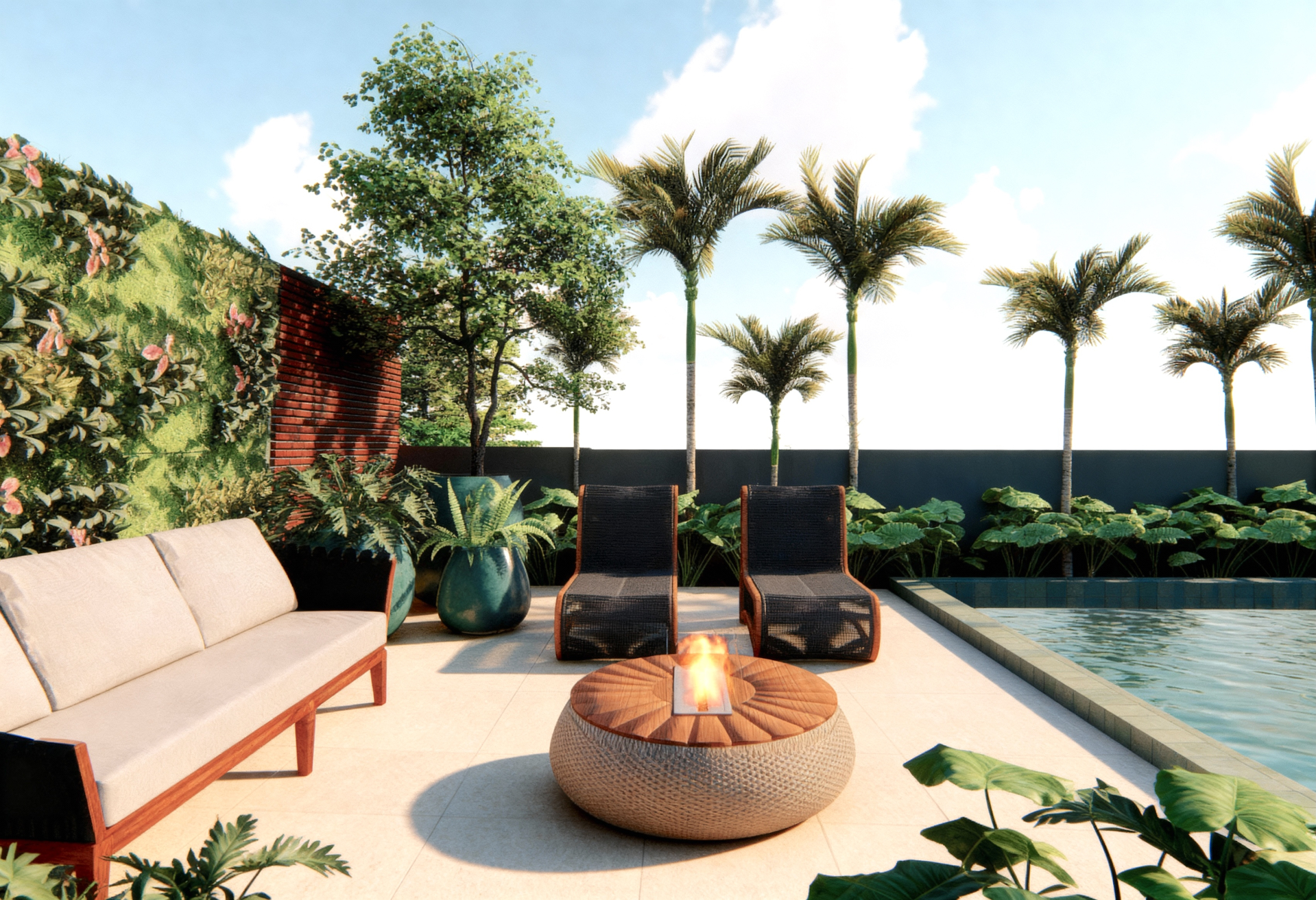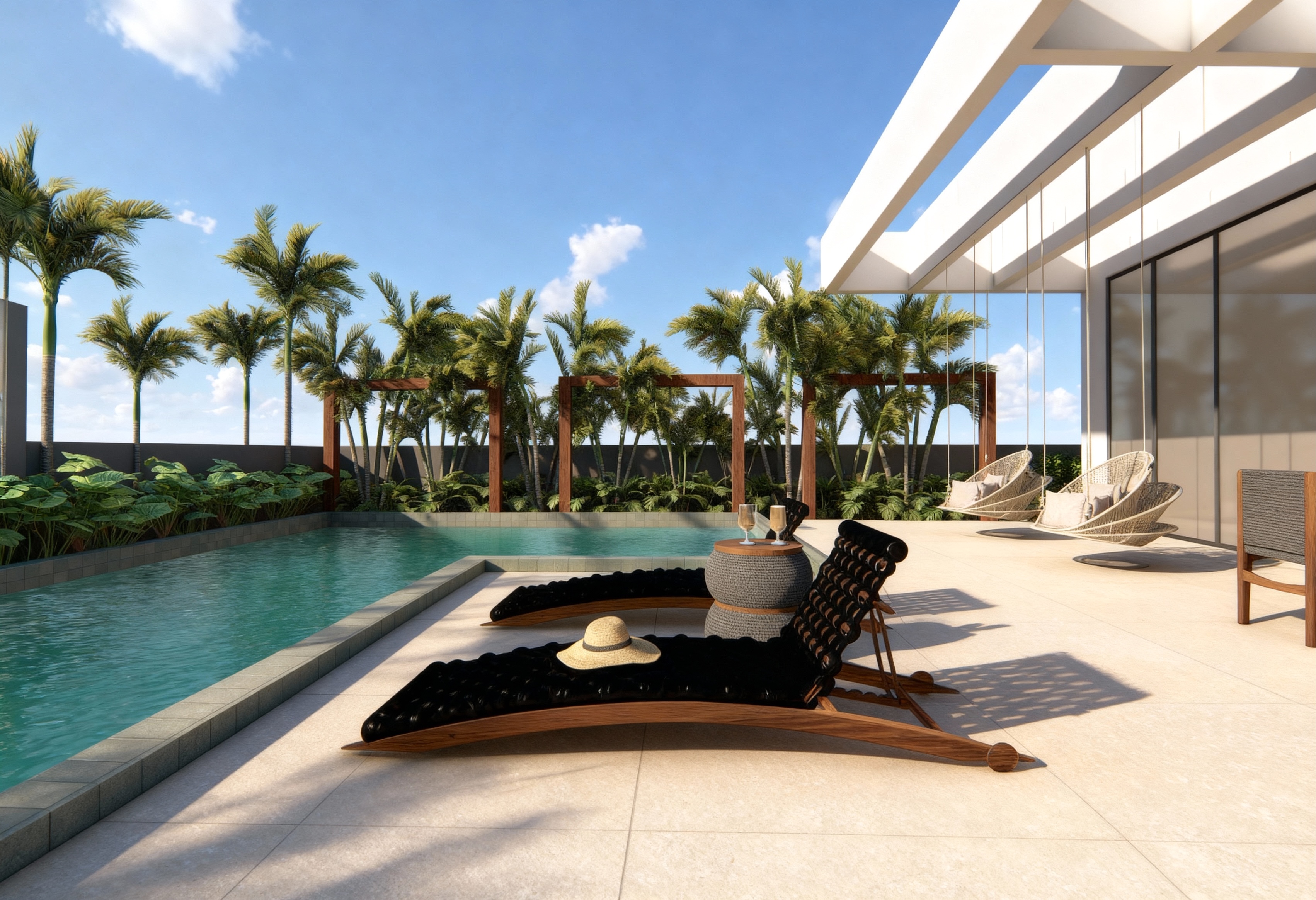 O paisagismo desta residência em Jurerê Internacional foi concebido para integrar a natureza ao cotidiano, trazendo sofisticação e aconchego aos espaços externos. Na fachada, uma árvore frutífera adiciona movimento e interesse ao longo das estações, enquanto as composições vegetais em vasos valorizam a arquitetura e criam uma recepção acolhedora. Na área da piscina, a seleção de vegetação tropical, aliada a uma praça de fogo e a arranjos cuidadosamente planejados, reforça a sensação de conforto e requinte. O conjunto combina elegância, funcionalidade e presença natural, resultando em um ambiente convidativo e equilibrado.