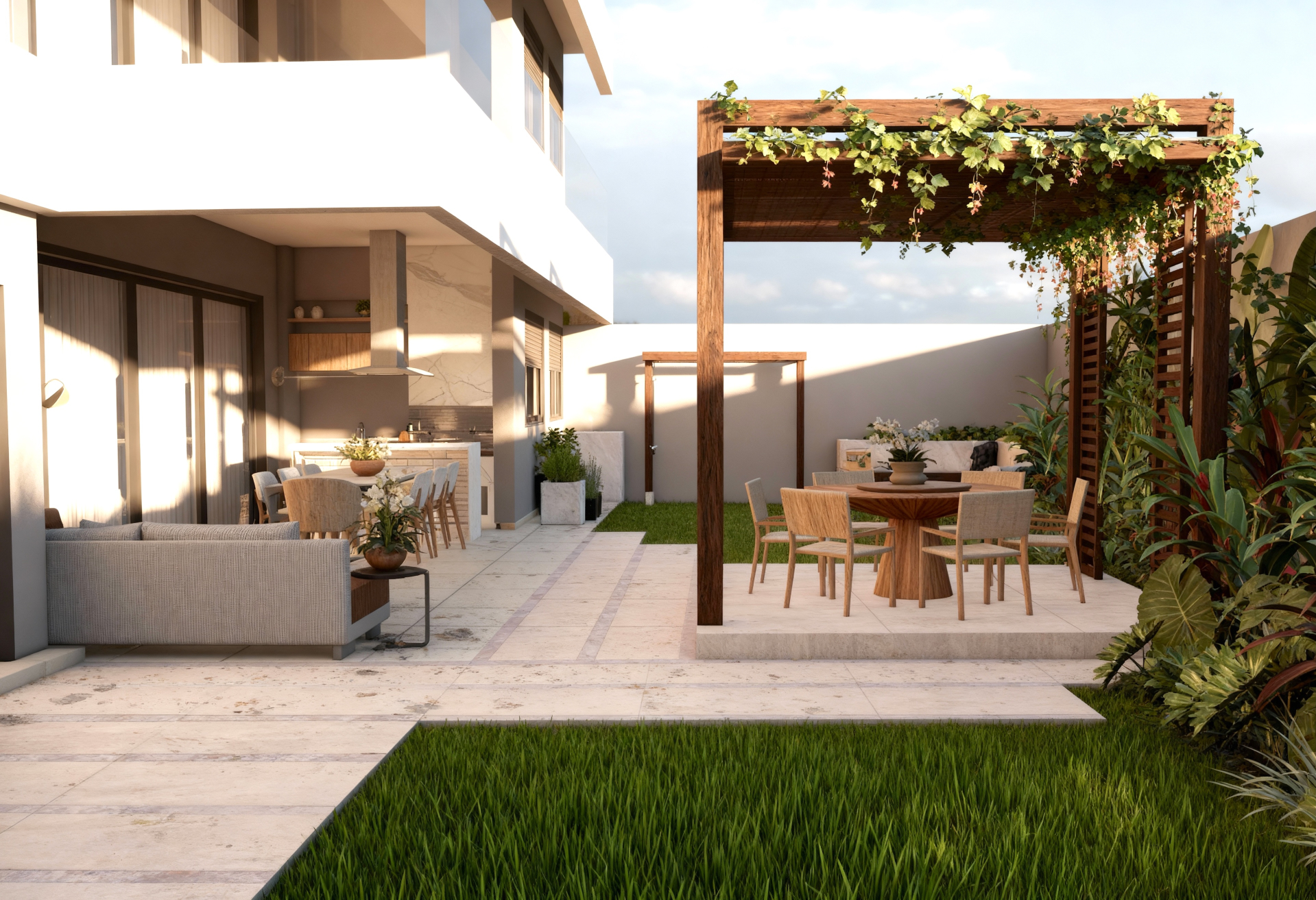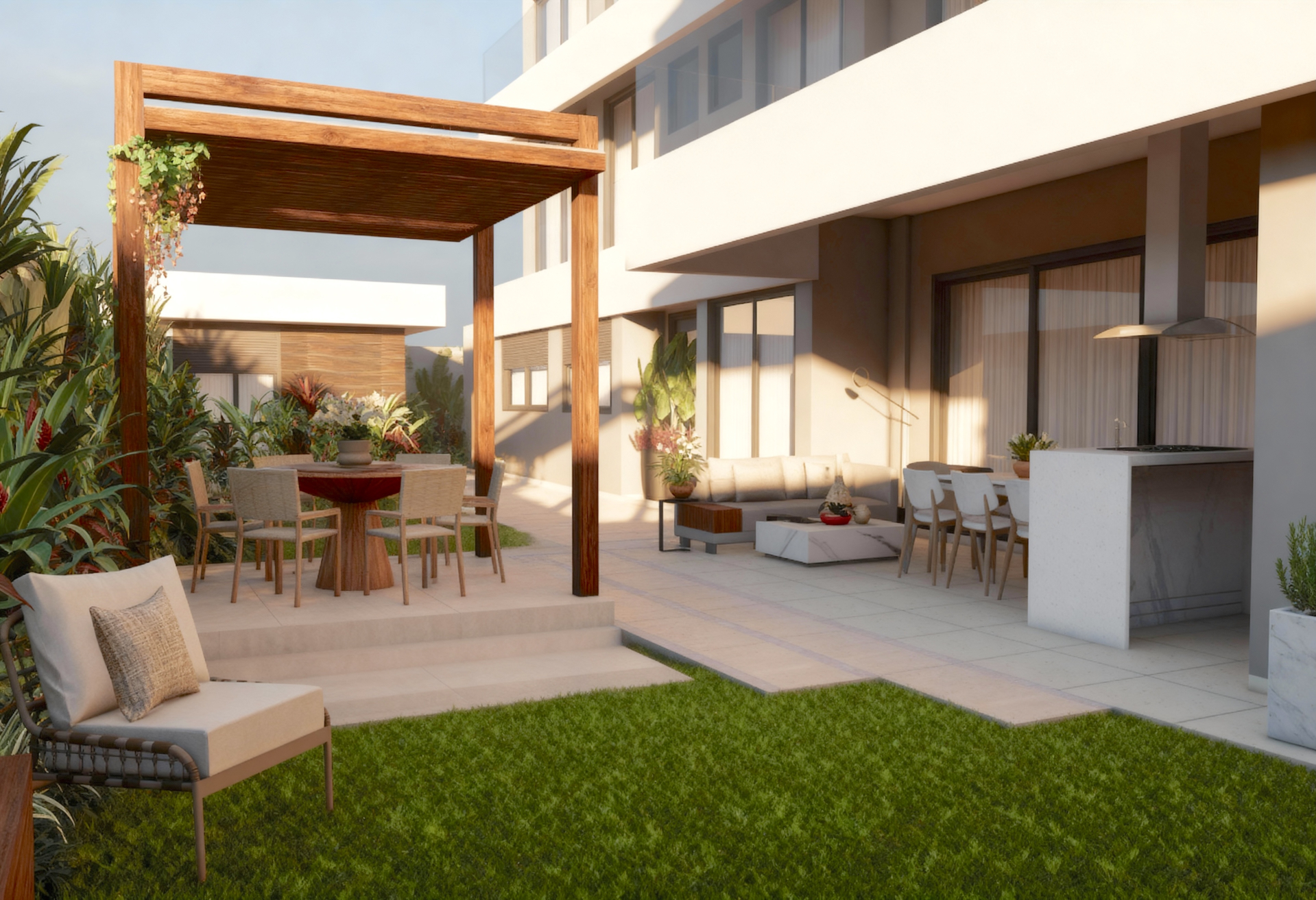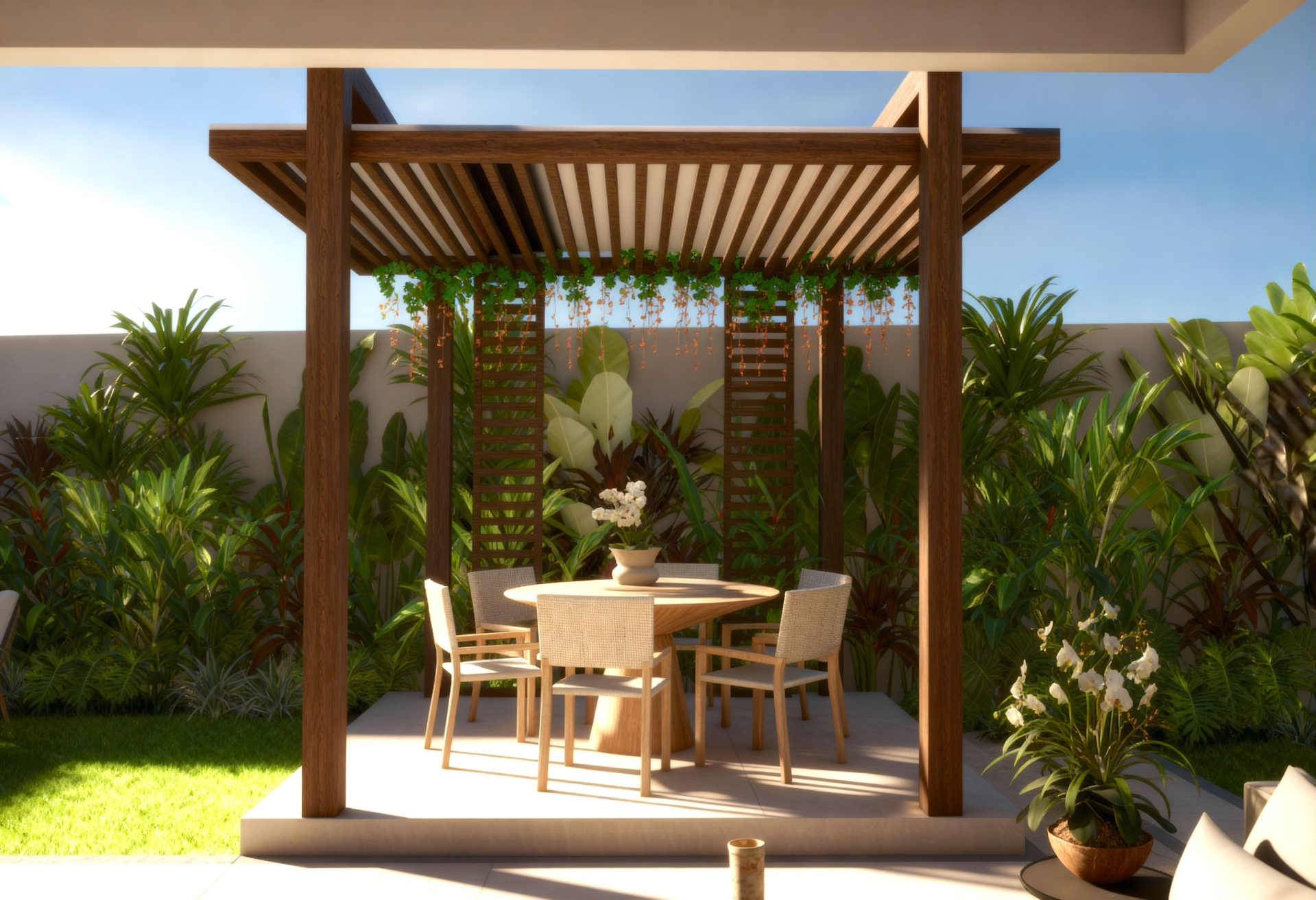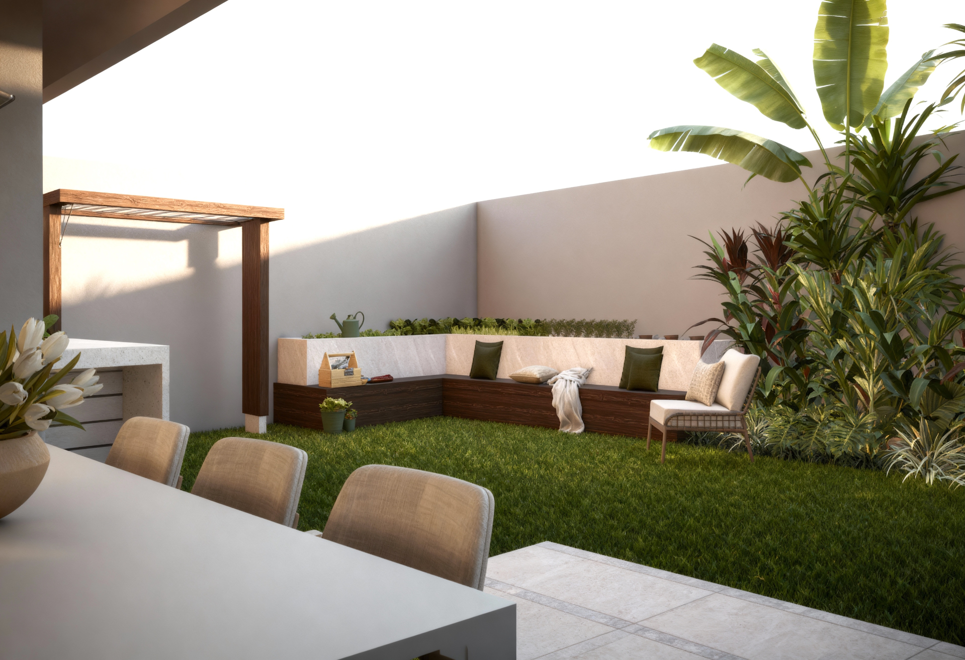 Neste projeto de paisagismo para um apartamento garden, unimos natureza e design para criar um refúgio sereno em meio ao contexto urbano. A seleção de plantas tropicais exuberantes introduz uma atmosfera de paraíso, enquanto o pergolado de madeira com treliça convida trepadeiras a formarem um telhado vivo que reforça sombra, frescor e aconchego. Um banco com horta incorporada acrescenta funcionalidade e aproxima os moradores da experiência de cultivo, estabelecendo uma conexão afetiva com o ambiente. A paleta de cores neutras harmoniza os elementos, garantindo equilíbrio visual e sensação de tranquilidade. O resultado é um espaço que celebra a vida ao ar livre, pensado para relaxar e se reconectar com a natureza em um ambiente único e acolhedor.