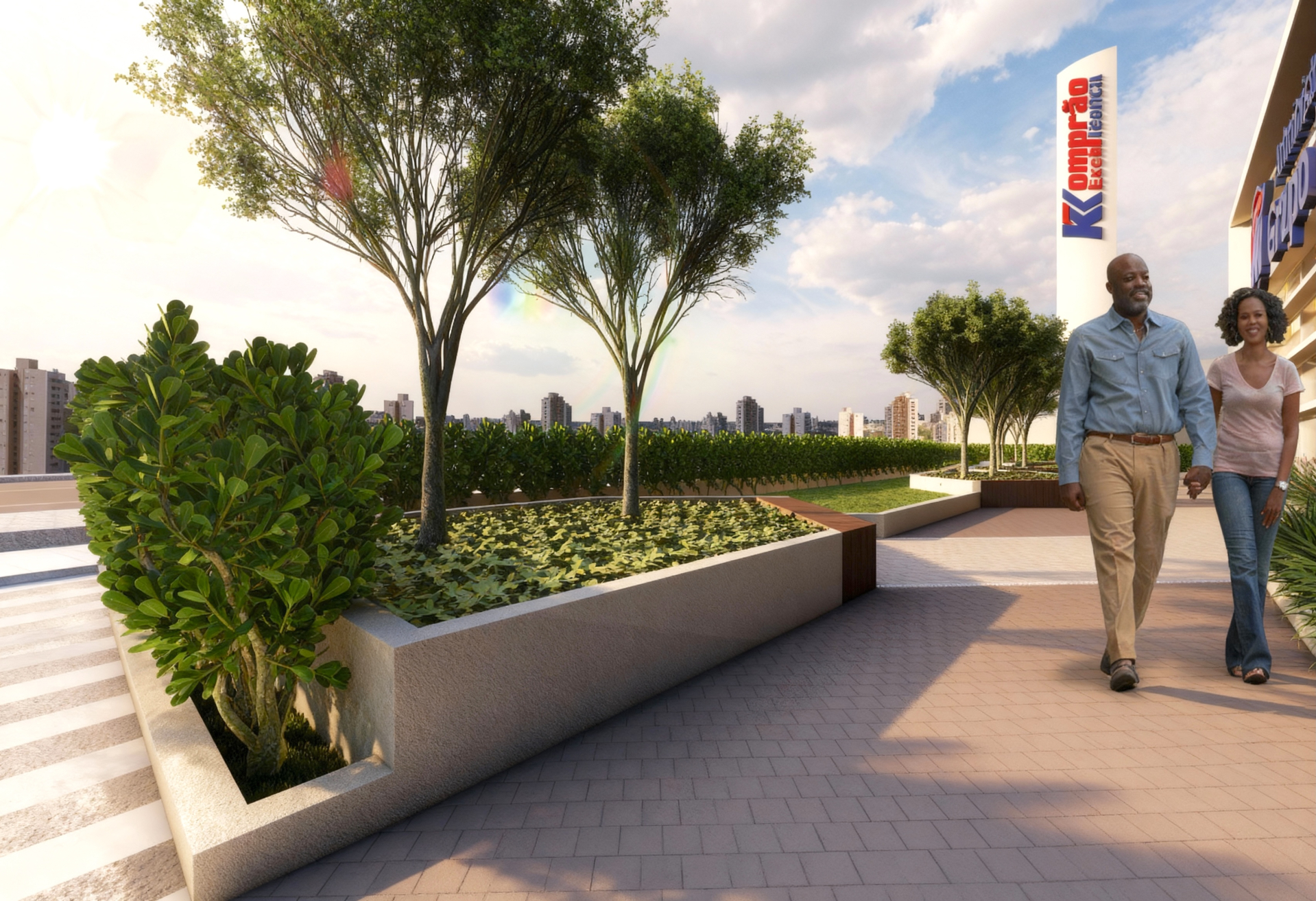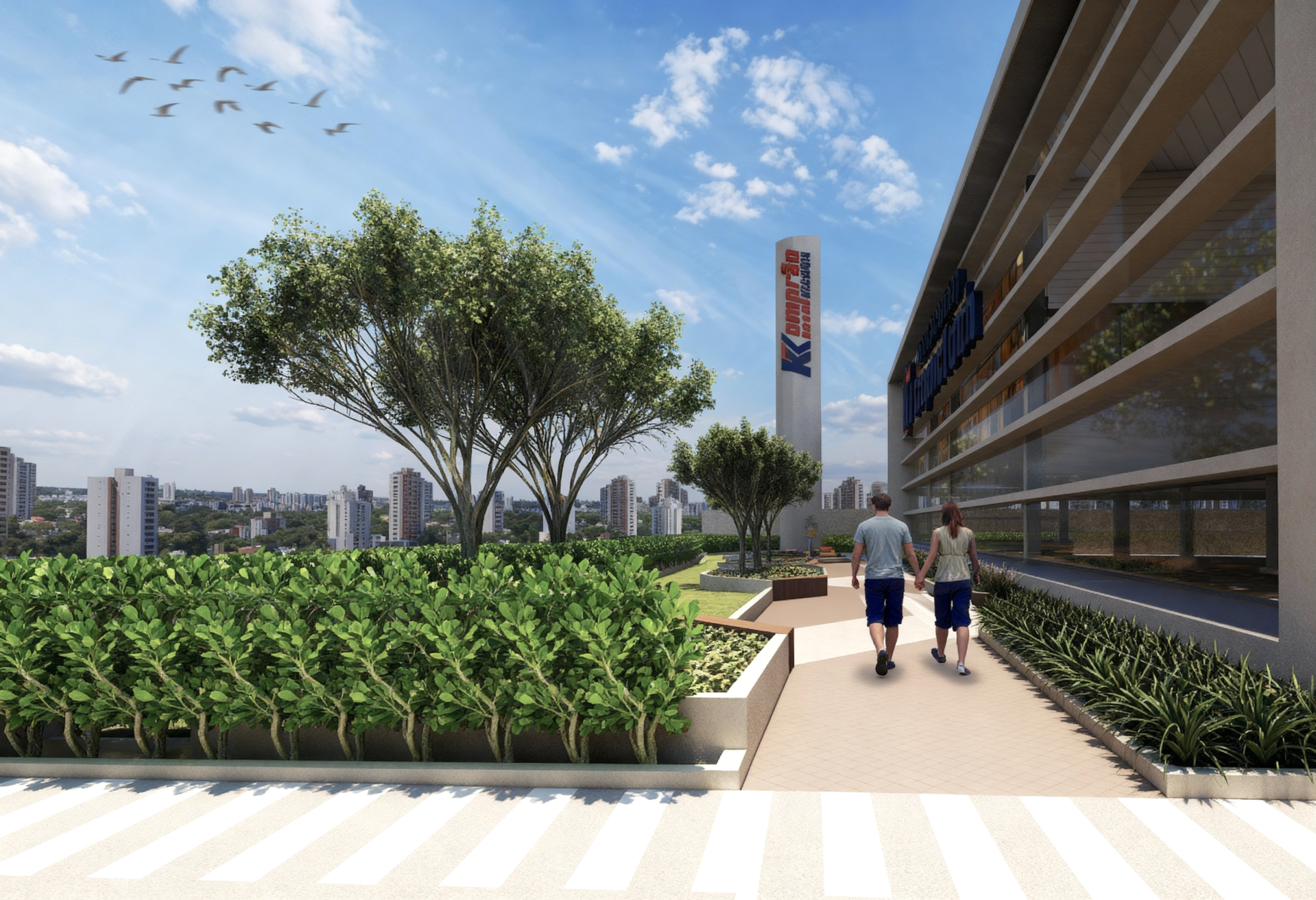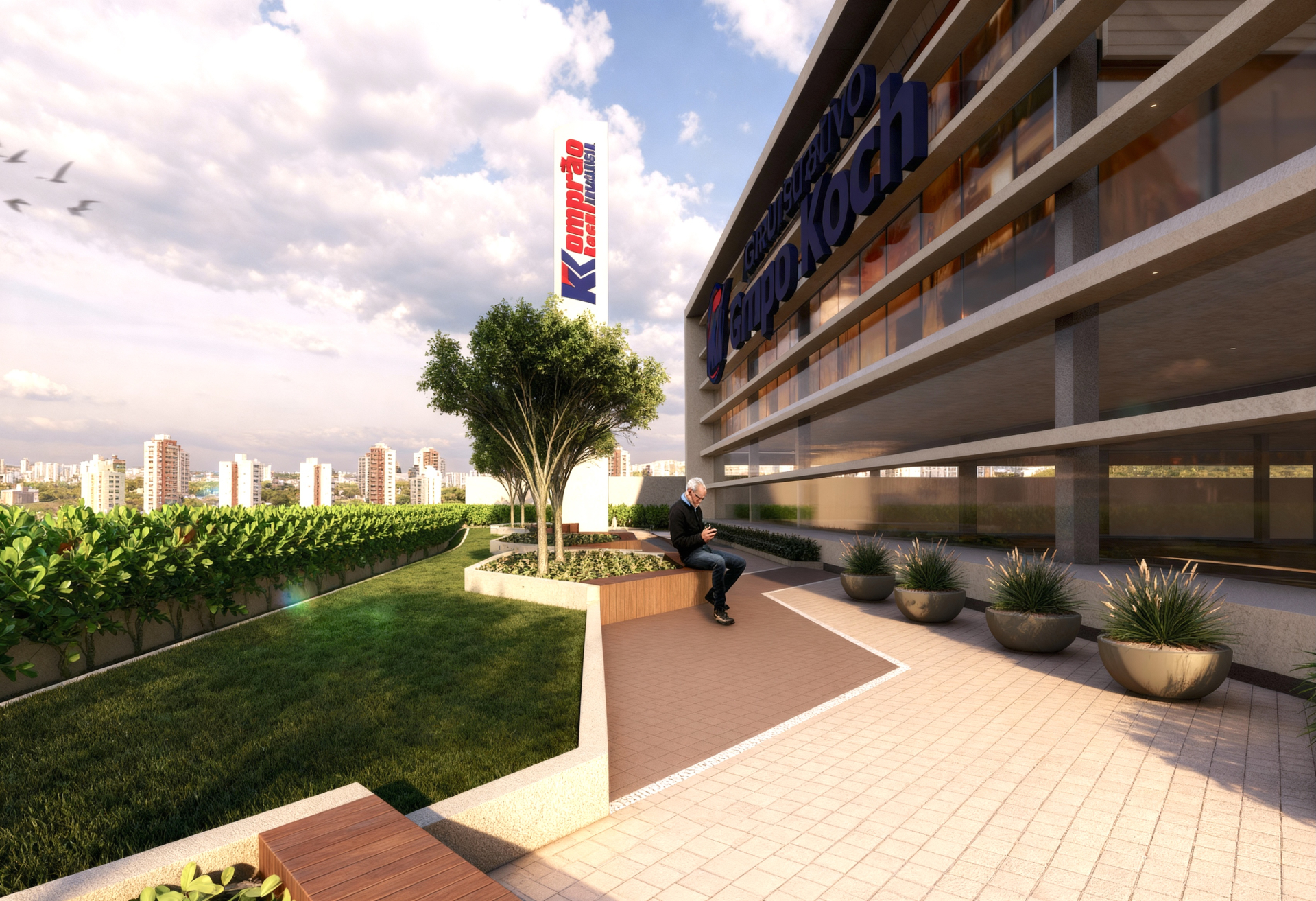 Neste projeto para a sede administrativa da Rede Koch, a arquitetura paisagística foi utilizada como ferramenta para aproximar as pessoas da natureza e criar interação harmoniosa entre as edificações e o espaço urbano. Orientado por princípios de biofilia, o projeto resultou na criação de uma nova praça pública — um ambiente de convivência que oferece momentos de descanso tanto para os usuários do mercado quanto para os funcionários.